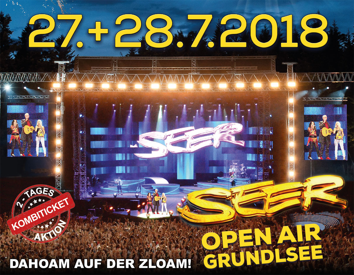 Am 27. und 28. Juli 2018 findet wieder das legendäre SEER Open Air in Grundlsee statt!  Das Festival-Wochenende bietet 2 Tage, die sich nicht nur im Rahmenprogramm, (FREITAG: Höhner, Folkhilfe, Drumatical Theatre; SAMSTAG: Hot Chocolate, Troglauer, High South) sondern auch im SEER-Konzert selbst, unterscheiden. Am Freitag, 27.7.2018, werden unter dem Motto „SEER und Freunde“, namhafte Musikgrößen wie Wolfgang Ambros, The Les Humphries Singers, Hans Krankl, Klaus Eberhartinger uvm. gemeinsam mit den SEERn auf der Bühne stehen, während der Samstag  ganz im Zeichen von „Die SEER – Nur das Beste“ steht. Erleben Sie die SEER nicht nur mit ihren größten Hits und einer atemberaubenden Licht- und Videoshow, sondern auch mit einem, speziell für diesen Abend, erweiterten Konzertklassiker. Viele Emotionen und Überraschungen bilden einen einmaligen und abwechslungsreichen Themenbogen bei diesem Heim-Konzert! Den Ausklang bildet wie gewohnt an beiden Tagen ein spektakuläres Klangfeuerwerk. Ein Besuch beider Tage, mit ermäßigtem Kombiticket-Preis, zahlt sich somit in jedem Fall aus!