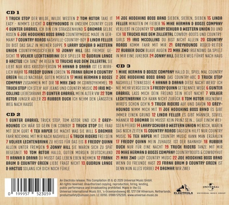 Mit dem 3-CD-Boxset “Country Made In Germany“ kann man jetzt in die Jahre zurückreisen, in denen Deutschland im Country-Fieber war, mit Hits im Radio, Cowboy- und Trucker-Festivals im ganzen Land und TV-Sendungen wie “It’s Country Time“ (ZDF) und „Kilometer 330“ (RTL). Hier sind nicht nur die immer noch aktiven Künstler dabei, sondern auch Songs von Fernweh und Freiheit von Cowboys, an die man sich heute gern wieder erinnern lässt, wie FRANK BAUM & COUNTRY GREEN, LARRY SCHUBA & WESTERN UNION, GREYHOUNDS, JOE HODGKINS, MIKE HERMAN und vielen anderen. Natürlich kommen auch Country-Ladies wie LINDA FELLER, DAGMAR, GUDRUN LANGE und IRIS MCCOLLINS nicht zu kurz.