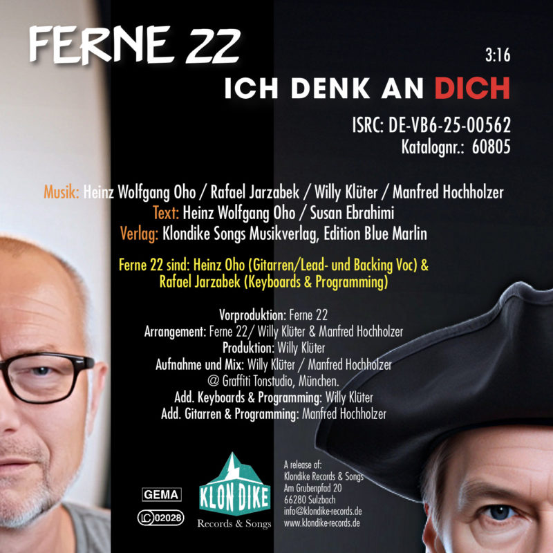 Mit ihrer Debüt-Single „Ich denk an dich“ präsentiert das Duo Ferne 22 einen gefühlvollen Ohrwurm, der einen tiefsinnig melancholischen Text mit einem modernen Klangbild verbindet. Das Projekt, bestehend aus HEINZ OHO und RAFAEL JARZABEK, feiert mit dieser Veröffentlichung seinen Einstand bei Klondike Records.