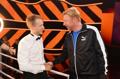 Zum Foto (Credit: RTL / Willi Weber) zeigt Boris Becker (r.) gratuliert Oliver Pocher zu seinem Sieg.
