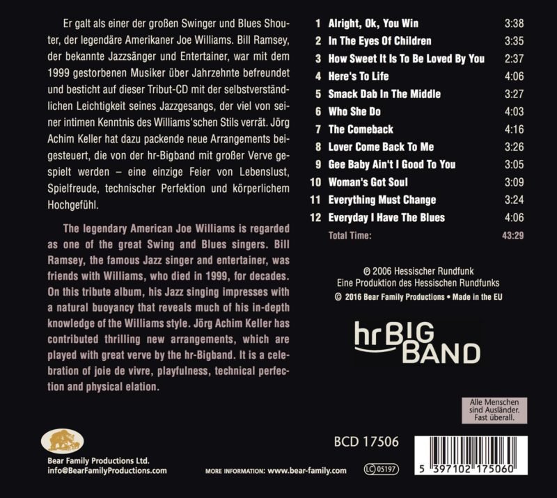Manche Alben sind mehr als Musik – sie sind Verbeugungen, Herzensangelegenheiten, Vermächtnisse. BILL RAMSEY, der unvergessene Entertainer und Jazz-Sänger, setzte mit diesem Album seinem großen Idol Joe Williams ein Denkmal. „Here’s To Life – Here’s To Joe“ ist kein gewöhnliches Tribute, sondern eine leidenschaftliche Liebeserklärung an einen der bedeutendsten Stimmen des Jazz.