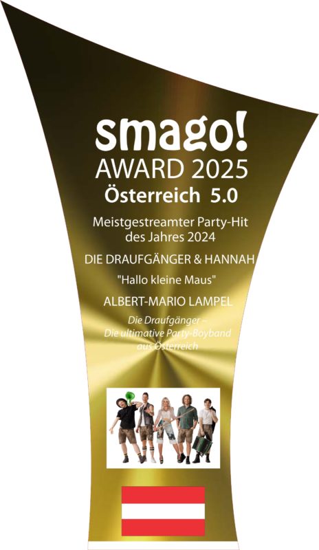 Nachdem wir im Vorjahr (2024) mit Sašo Avsenik & seinen Oberkrainern bereits ‚Das Original‘ beim smago! Award Österreich & Südtirol 2024 begrüßen durften, waren es „heuer“ DIE DRAUFGÄNGER & HANNAH, die am 10.04.2025 beim smago! Award Österreich 5.0 in der Kategorie „Meistgestreamter Party-Hit des Jahres“ (in Österreich) für den Titel „Hallo kleine Maus“ ausgezeichnet wurden.
