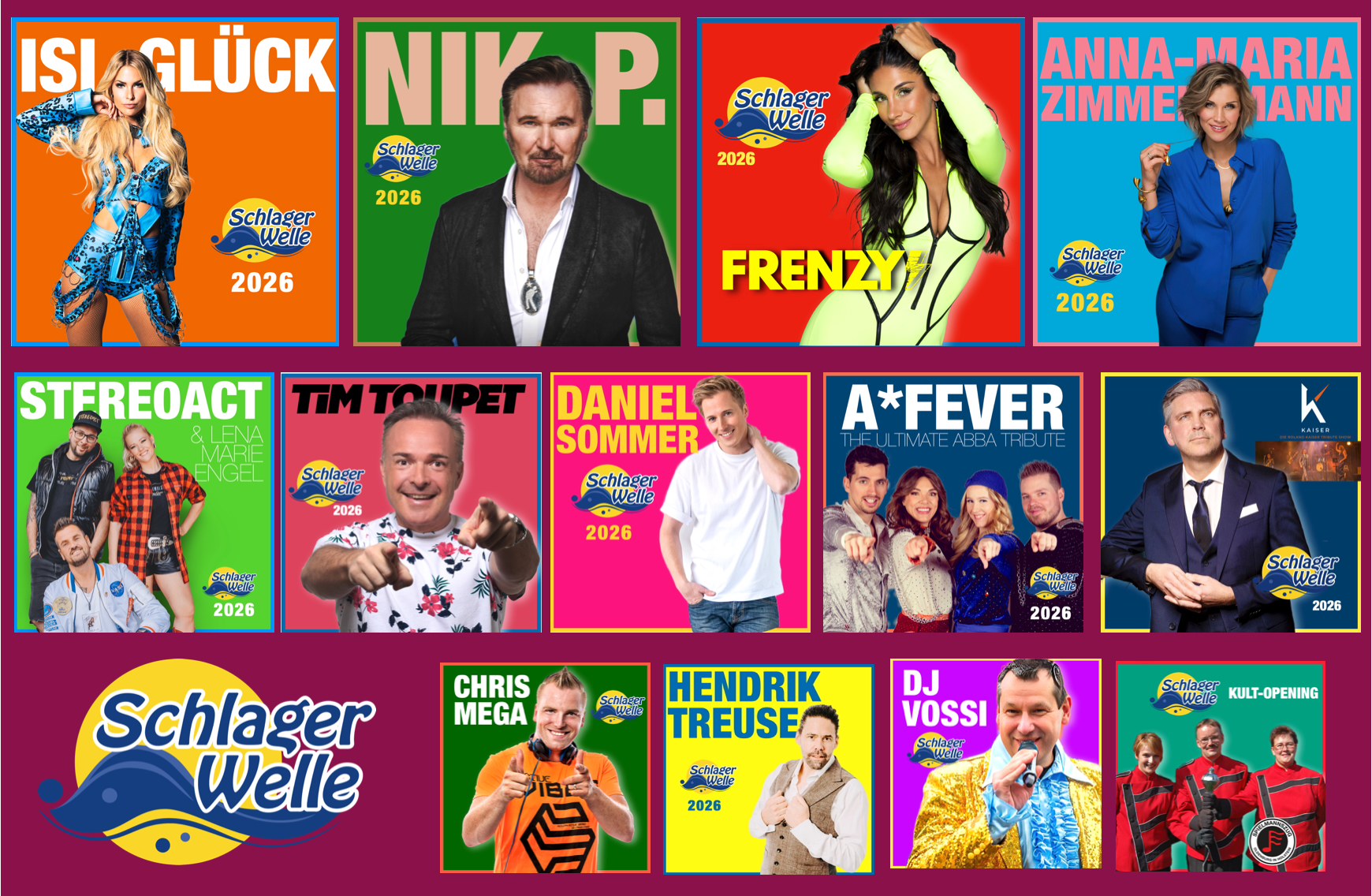 In diesem Jahr präsentiert die Band „Kaiser“ um Frontmann Carsten Heinze die größten Roland Kaiser Hits. Und mit A*Fever ist es den Veranstaltern gelungen die im TV siegreiche ABBA-Tribute-Show mit ihrem ersten Deutschland-Auftritt zu verpflichten. Sänger Nik P., Daniel Sommer und Anna-Maria Zimmermann stehen für modernen Pop-Schlager. Letztere auch für Party, denn seit einer Saison begeistert die Sängerin ihr Publikum im Mega-Park auf Mallorca. Mit den zwei Partyköniginnen Frenzy und Isi Glück (sitzt bald auch bei RTL in der DSDS-Jury) stehen zwei Top-Acts aus den Ballermann-Tempeln „Bierkönig“ und „Mega-Park“ auf der Festival-Bühne.