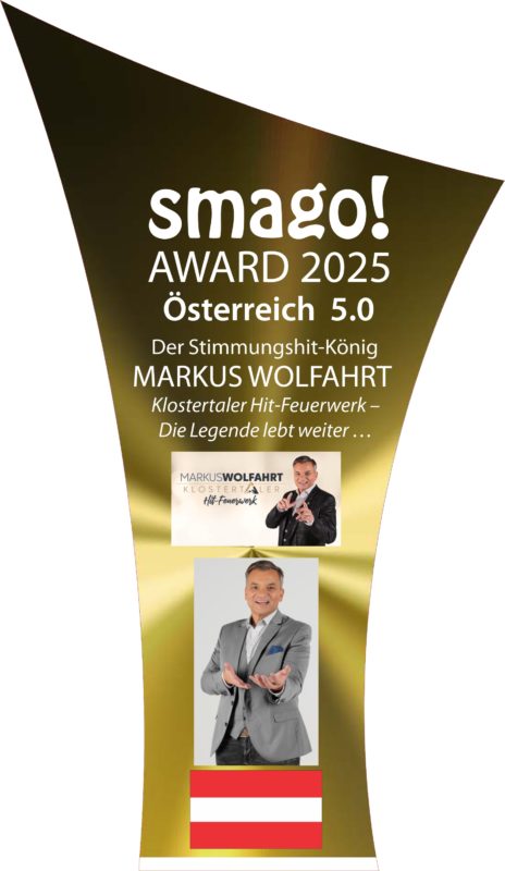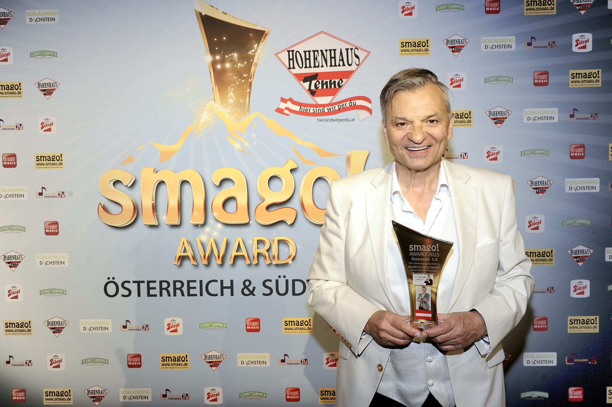 MARKUS WOLFAHRT wurde am 10.04.2025 in der Hohenhaus Tenne in Schladming im Rahmen der smago! Awards Österreich 5.0 als „Der Stimmungshit-König“ geehrt.