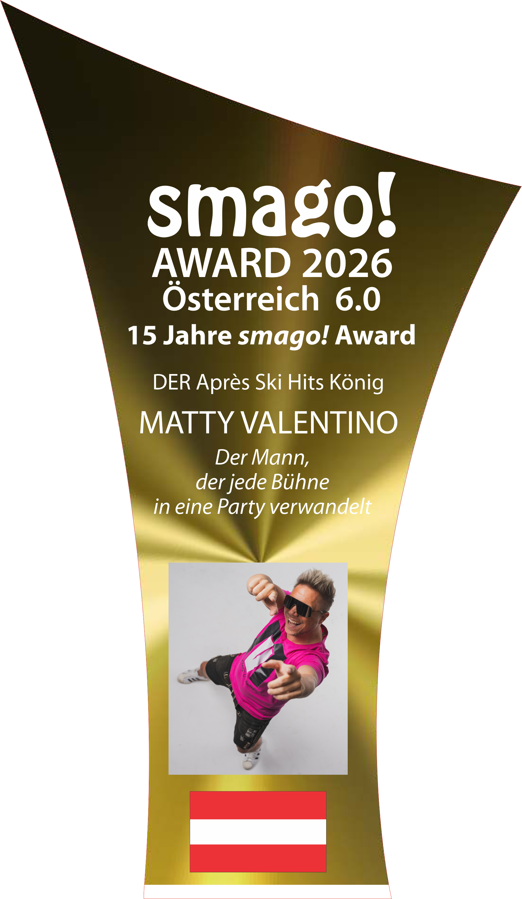 Dafür erhielt er am 08.04.2026 beim smago! Award Österreich 6.0 – 15 Jahre smago! Award in der Hohenhaus Tenne in Schladming – noch dazu als Headliner! – den smago! Award als Après-Ski-Hits-König.