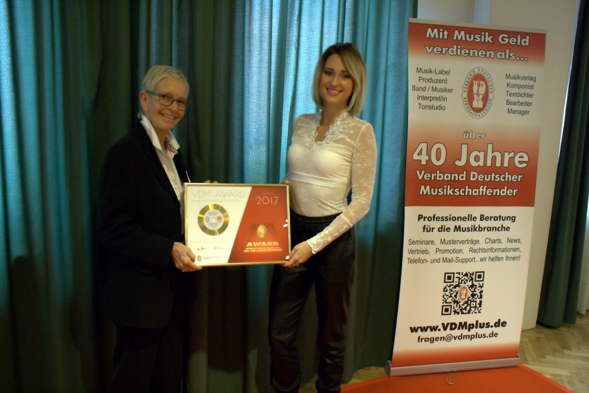 Vergangenes Wochenende erhielt Madeline Willers den VDM-AWARD 2017 für ihren Hit „Bessere Hälfte“ von Helga Quirini (VDM) überreicht. Für die junge talentierte Künstlerin aus Wüstenrot bereits der dritte Preis in Folge. Erst kürzlich gewann Madeline Willers mit "Frei wie der Wind" den Sommerhit Wettbewerb 2017 auf SCHLAGERportal. Im Juni konnte sie die Jury des The Akademia Music Award in der Kategorie bester Pop Song von sich überzeugen. Nun konnte Madeline Willers mit ihrer Single „Bessere Hälfte“, die nicht weniger als 23 Wochen in den TOP 100 der Radio-Airplays platziert war, auch diese Jury für sich begeistern.