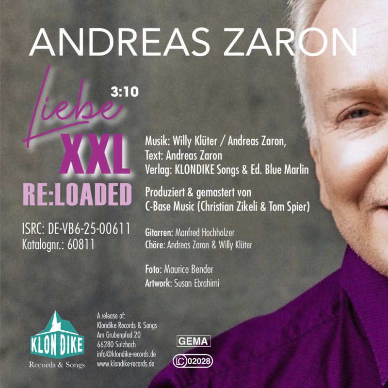Im Sommer 2021 feierte Schauspieler ANDREAS ZARON sein musikalisches Comeback – und das mit einem echten Hit: „LIEBE XXL“ wurde zum Radio-Dauerbrenner und setzte seine Erfolgsserie nahtlos fort. Jetzt gibt’s das Ganze, auf vielfachen Wunsch, in einer neuen Version: „Liebe XXL – Re:loaded“. Noch mehr Groove, noch mehr Dance-Vibes! Das Team rund um C-Base-Music Studio (Christian Zikeli & Tom Spier) hat ordentlich abgeliefert, und die Original-Produktion (Musik und Text: Willy Klüter und Andreas Zaron) mit frischen Beats und aktuellen Sounds direkt ins Jahr 2025 katapultiert.