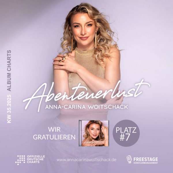 „Abenteuerlust“ ist ein Album voller Power, Lebensfreude und persönlicher Geschichten. Jeder Track hat seinen eigenen Charakter – Anna-Carina Woitschack beweist einmal mehr ihre musikalische Vielseitigkeit. Kein Wunder, dass die Sängerin inzwischen nicht nur eine treue Fanbase, sondern auch fast eine halbe Million Follower in den sozialen Netzwerken hat.