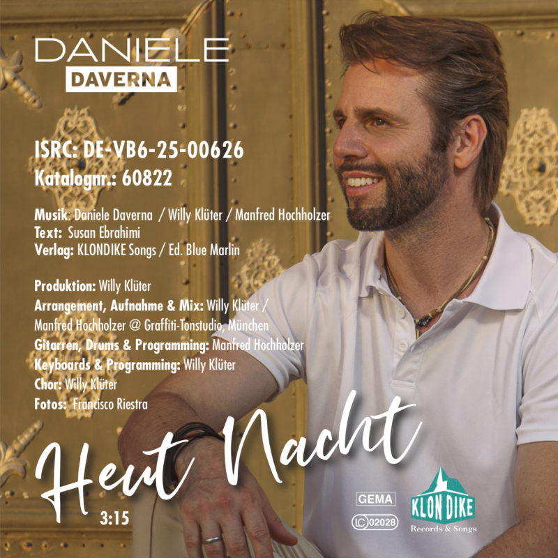 Mit seiner neuen Single „Heut Nacht“ beweist der Italo-Bayer DANIELE DAVERNA einmal mehr, dass er zu den gefühlvollsten Stimmen im deutschsprachigen Schlager gehört. Der Song, den der Sänger selbst textete, ist eine leidenschaftliche Liebeserklärung – voller Romantik, Sehnsucht und Glück. „Heut Nacht will ich die Sterne in deinen Augen wieder glitzern sehen“ – diese zentrale Zeile steht für die Botschaft: Das Leben ist dann vollkommen, wenn man es mit der großen Liebe teilen darf.