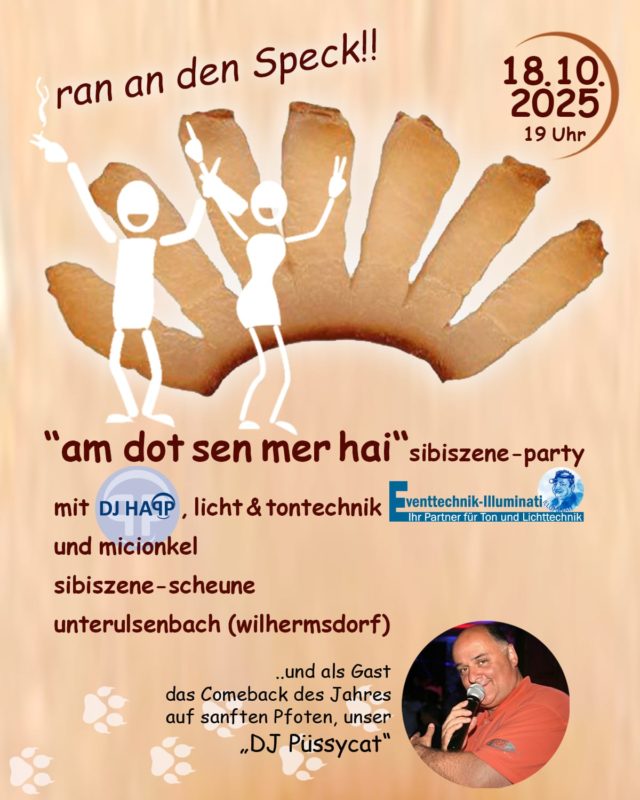 Nach sage und schreibe 5 ½ Jahren Pause gibt DJ MICHA alias DJ Pussycat am 24.10.2025 bei der „Sibiszene Party“ in der „Sibiszene-Scheune“ in Unterulsenbach (Wilhermsdorf) sein lang ersehntes DJ Comeback.