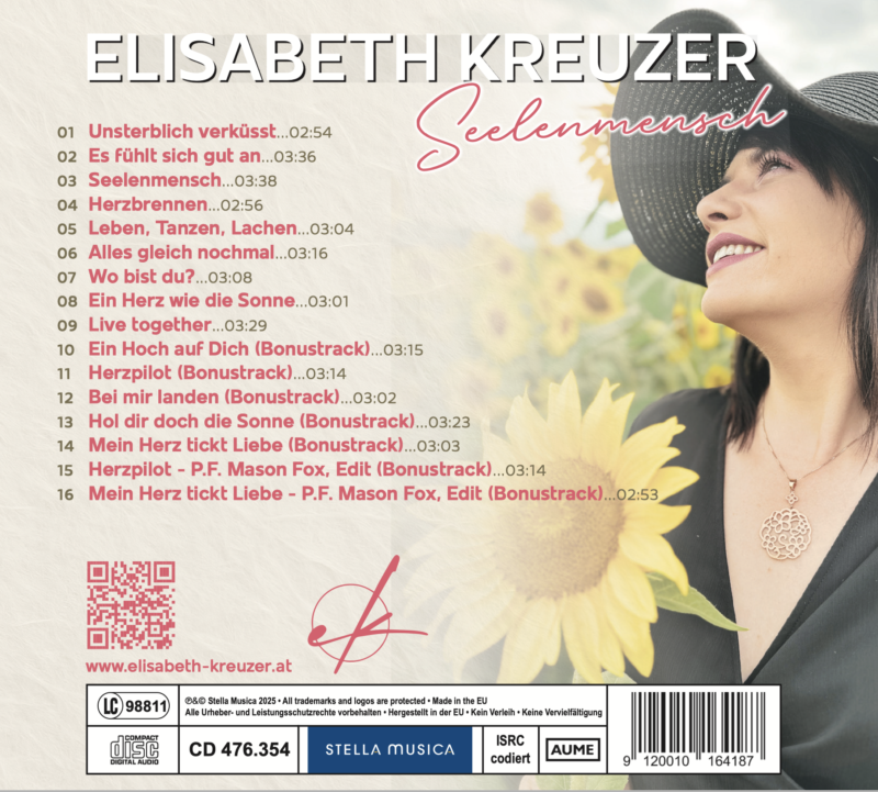 Mit „Seelenmensch“ gelingt ELISABETH KREUZER nicht nur ein beeindruckendes Comeback, sondern auch ein Album, das Herzen berührt und Mut schenkt. Jeder Song, ob Popschlager wie „Herzbrennen“ oder „Leben, Tanzen, Lachen“, gefühlvolle Balladen wie „Wo bist du?“ und „Seelenmensch“ oder die lebensbejahenden Covertracks, zeigt ihre Fähigkeit, Emotionen authentisch zu vermitteln. Das Werk ist eine Hommage an Liebe, Freundschaft und die Menschen, die unser Leben bereichern.