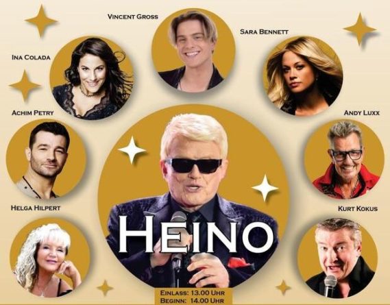 Als super TOP-Act ist es gelungen, niemand Geringeren als HEINO höchstpersönlich, den absoluten MEGA – Star des deutschen Schlagers mit all seinen großen Hits für die Veranstaltung zu gewinnen. Der weit über die Grenzen hinaus international , bekannte Schlager-Barde freut sich riesig darauf dabei zu sein und seine langjährige Freundin Helga Hilpert, die auch wieder einige ihrer Hits zum Besten geben wird, wiederzusehen und bei der Schlagerveranstaltung zu unterstützen.