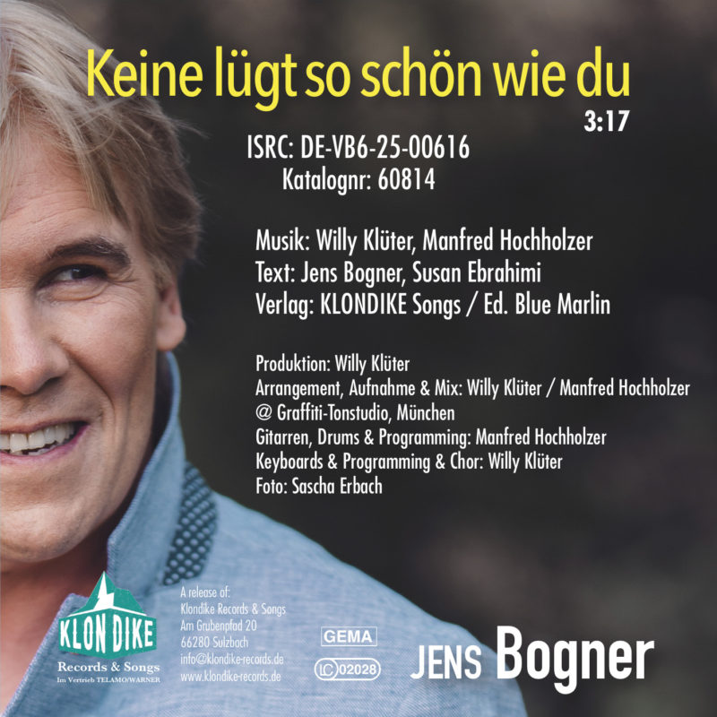Der Text stammt aus der Feder von JENS BOGNER höchstselbst und SUSAN EBRAHIMI, die Musik wurde komponiert von WILLY KLÜTER und MANFRED HOCHHOLZER – ein Team, das für eingängige, moderne Schlagerproduktionen steht. Wie bei JENS‘ Label Klondike üblich, wurde auch von „Keine lügt so schön wie du“ ein hochwertiges Musikvideo produziert – diesmal von der Filmproduktion MICHAEL SCHORLEPP.
