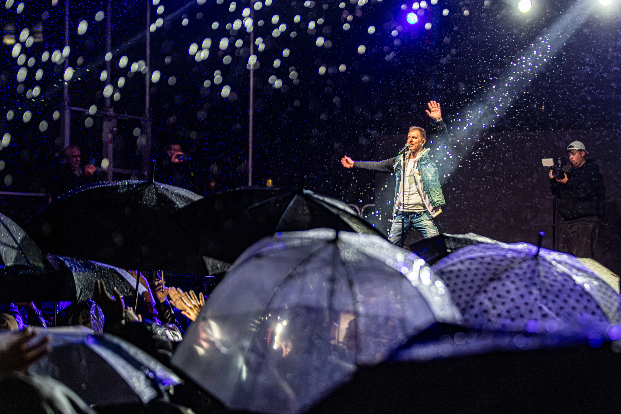 Als das Gewitter schließlich weiterzog – der Regen aber blieb – geschah etwas, das man nicht inszenieren oder kaufen kann: Die Fans kamen wieder. Im strömenden Regen füllten sie den Platz erneut, standen Schulter an Schulter – mit Regenschirmen, in Ponchos oder einfach durchnässt –, aber voller Vorfreude.