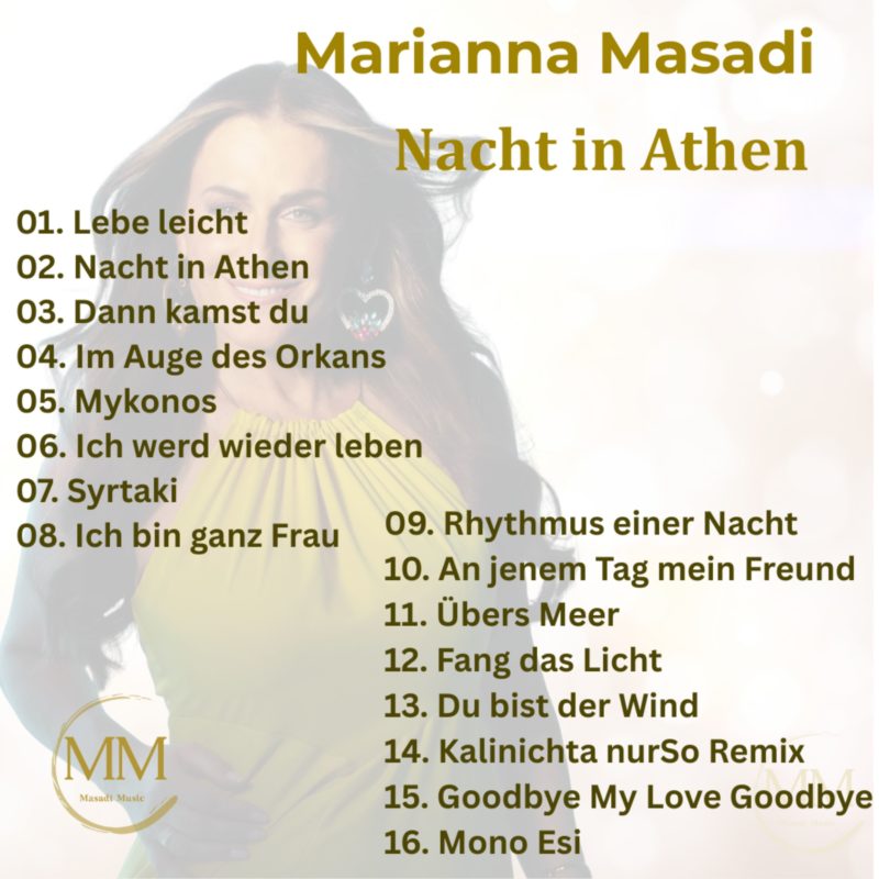 Marianna Masadis Musik lebt von Emotion, Vielfalt und einer Stimme, die Herz und Seele berührt. Ihre Songs erzählen von Liebe, Verlust, Hoffnung und Neubeginn, getragen von einer Intensität, die sofort unter die Haut geht. Wie einst Nana Mouskouri, Demis Roussos oder Vicky Leandros gelingt es auch ihr, zeitlose Gefühle in ein modernes Klangbild zu übersetzen. Mit „Nacht in Athen“ präsentiert sie ein Album, das facettenreich, authentisch und unverkennbar Marianna Masadi ist.