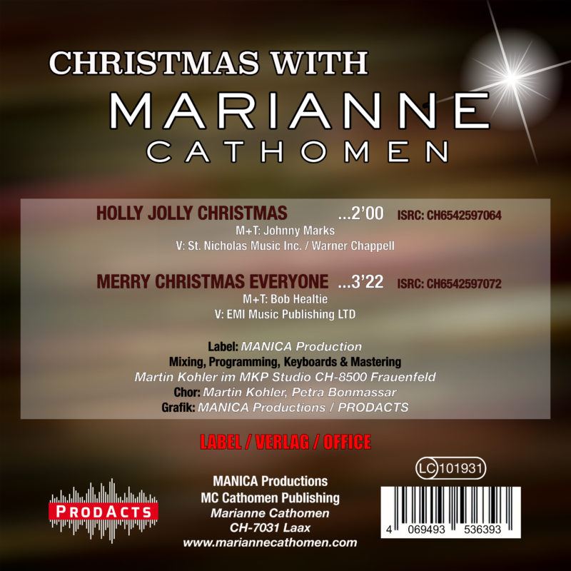 Passend zur vorweihnachtlichen Stimmung bringt die international bekannte Schweizer Sängerin und Gewinnerin des I“Grand Prix der Volksmusik, MARIANNE CATHOMEN, zwei Weihnachtssongs als Cover heraus.