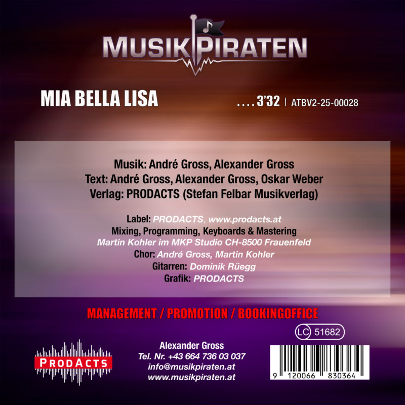 Mit „Mia bella Lisa“ präsentieren uns die MusikPiraten eine gefühlvolle Liebeserklärung, die mitten ins Herz trifft. Der eingängige Schlager verbindet sowohl mediterranes Lebensgefühl als auch tief empfundene „Amore“-Romantik, gekoppelt mit einem eingehenden Hook und professionellem, modernen Schlagersound.