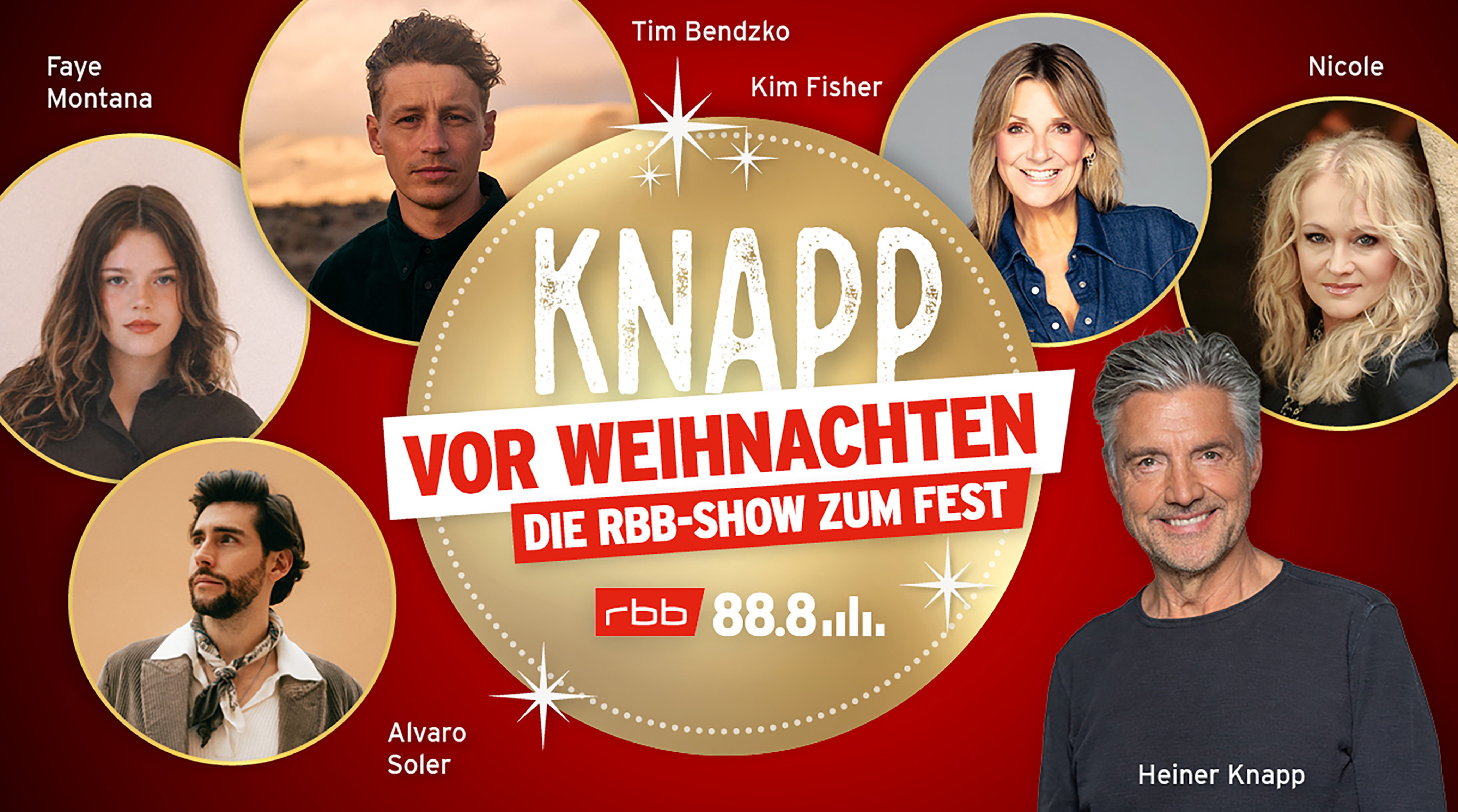 „Knapp vor Weihnachten“ bringt kurz vor Weihnachten eine bunte Mischung an Weihnachtsliedern komplett live gesungen aus dem Großen Sendesaal des rbb in die heimischen Wohnzimmer. Heiner Knapp hat sich seine musikalischen Lieblingsgäste eingeladen: Nicole, Alvaro Soler, Kim Fisher, Tim Bendzko und Faye Montana.