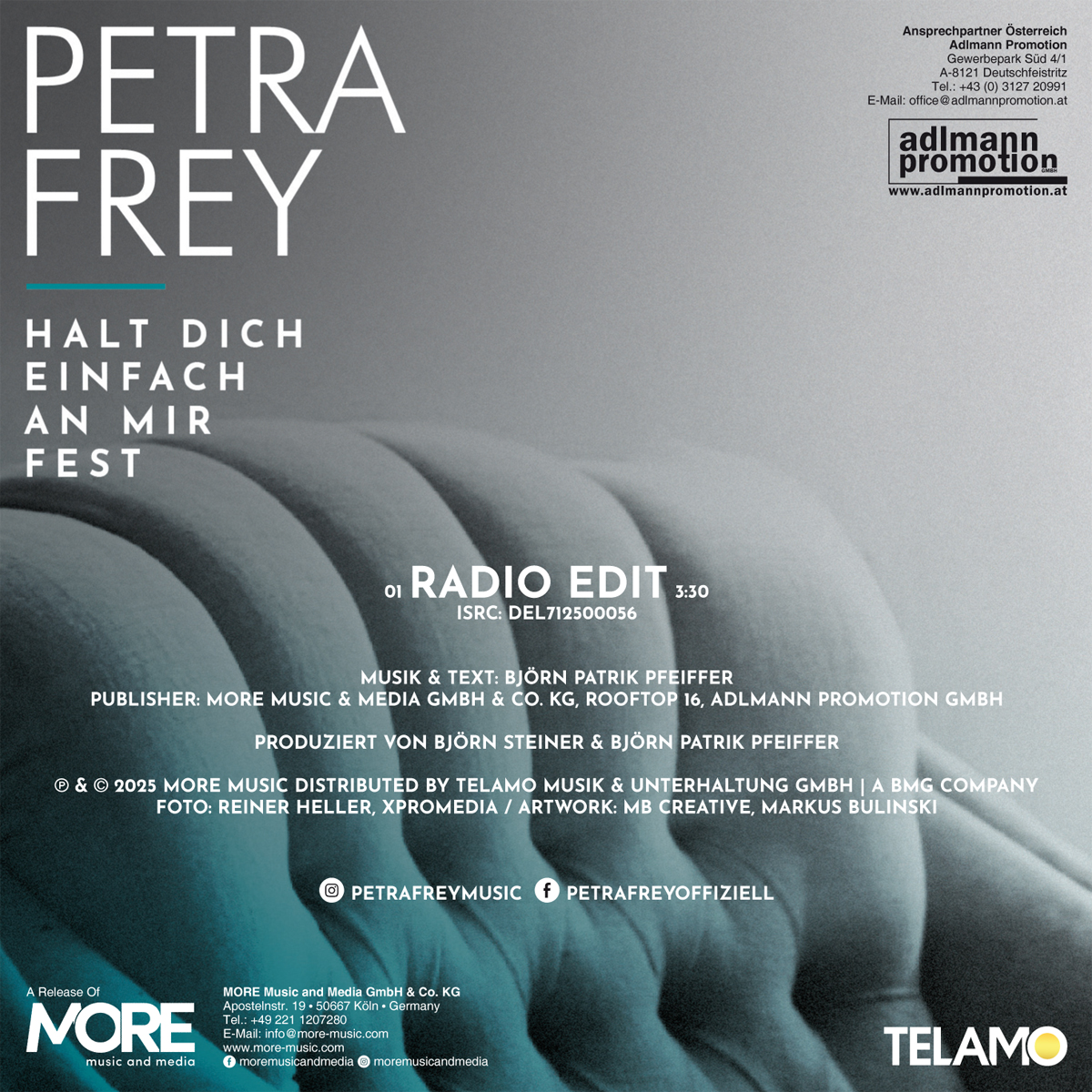 Die österreichische Ausnahmestimme PETRA FREY schenkt ihren Fans einen neuen Ohrwurm: Am 12.09.2025 erschien ihre aktuelle Single „Halt dich einfach an mir fest“. Der Titel ist eine Hymne auf die Liebe, den Zusammenhalt und das Vertrauen – Werte, die in unsicheren Zeiten wichtiger denn je sind.