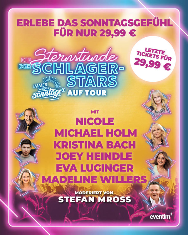 „Letzte Tickets für € 29,99“ erhältlich – für „Die Sternstunde der Schlagerstars – Immer wieder sonntags auf Tour“!