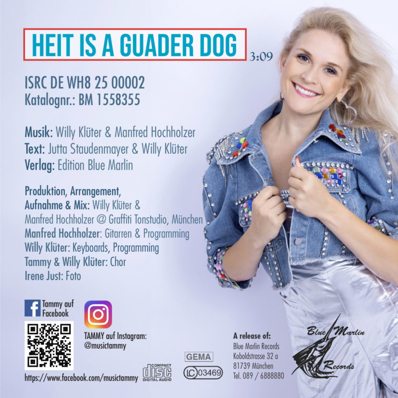 Morgen ist ein anderer Tag aber „Heit is a guader Dog“ die neue Single von Tammy, die uns sogar zum „Durch den Regen tanzen“ anregt, stammt wie immer von Tammy‘s bewährtem Produzententeam Willy Klüter und Manfred Hochholzer, den Text steuerte wieder Jutta Staudenmayer bei.