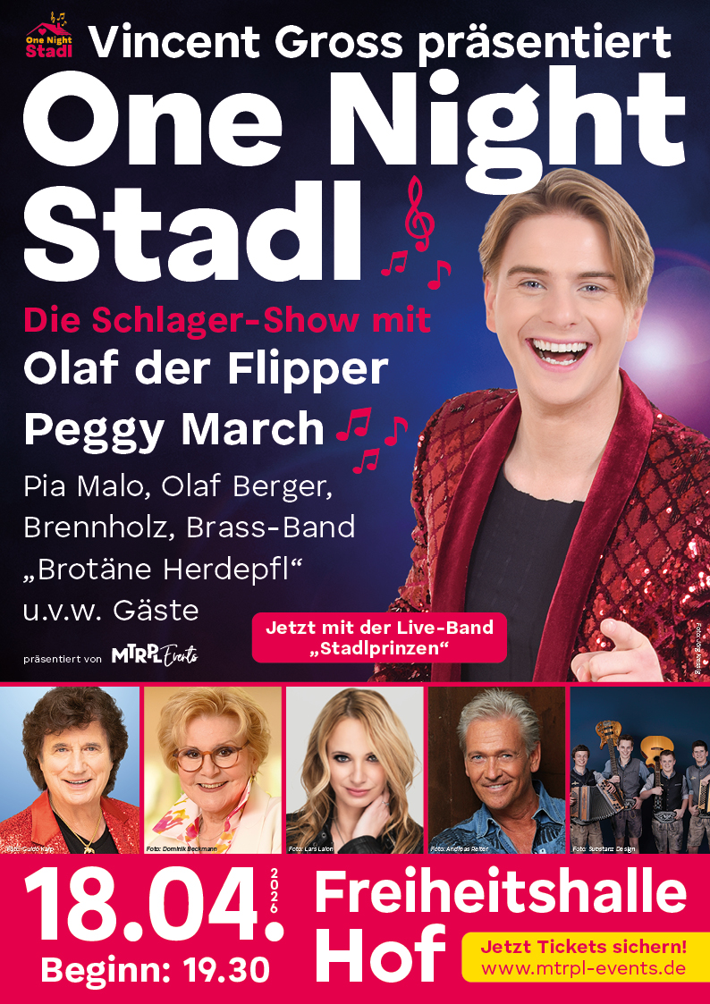 Der Vorverkauf für die nächste Ausgabe von „One Night Stadl“ am 18. April 2026 in der Freiheitshalle Hof hat begonnen. Nach mehreren ausverkauften Shows in Röthenbach an der Pegnitz präsentiert sich das beliebte Schlagerformat in Hof mit einer musikalischen Großproduktion. Zum ersten Mal wird der gesamte Abend live von den Stadlprinzen begleitet, die für echtes Konzert-Feeling und ein besonders intensives Musikerlebnis sorgen.