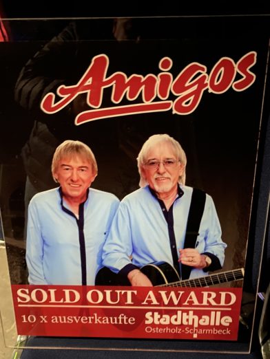 Matthias Renken lobte auch die Umgänglichkeit der Amigos Bernd und Karl-Heinz samt Manager Wilfried Emig und „diese Atmosphäre, die ihr hier versprüht“: „Es ist etwas ganz Besonderes, wenn ihr da seid und es macht ganz besonders Spaß. Wir möchten eigentlich heute im Namen der Stadthalle und der ganzen Fans aus nah und fern, die ihr habt, einmal Danke sagen. Und wer zehn Mal die gleiche Stadthalle ausverkauft, der ist es auch wert, dass er einen ‚mega Sold Out Award‘ bekommt. Ihr bekommt heute eine Auszeichnung für zehnmal ausverkaufte Stadthalle Osterholz-Schambeck!“.