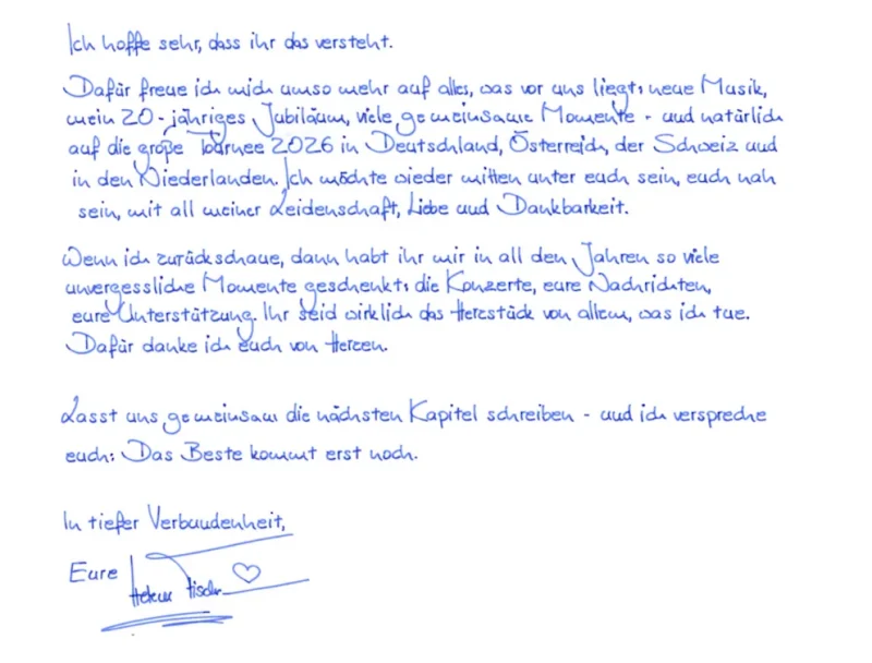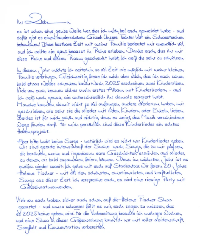 „Für die Vorbereitung brauche ich mehrere Wochen, und eine Show in dieser Größenordnung kann ich nur mit voller Leidenschaft, Sorgfalt und Konzentration vorbereiten“, schreibt Helene in einem 2-seitigen Brief an ihre Fans, den wir Ihnen natürlich nicht vorenthalten möchten.