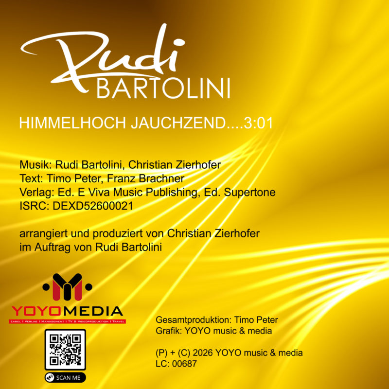 Mit „Himmelhoch jauchzend“ startet Rudi Bartolini nun in ein neues Kapitel seiner Karriere. Die Single steht sinnbildlich für Aufbruch, Emotion und Lebensfreude – ganz im Stil des klassischen Schlagers, aber gleichzeitig frisch und zeitgemäß interpretiert. Für seine Fans bedeutet diese Veröffentlichung weit mehr als nur einen neuen Song: Sie ist das klare Signal, dass noch viele weitere Titel folgen werden.