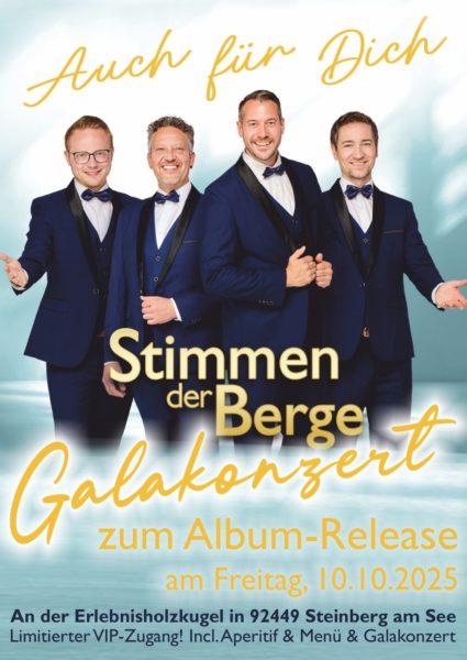 Die Stimmen der Berge selbst hatten insgesamt drei Konzertblöcke à jeweils 60 Minuten. Somit konnten sie ihre ungemeine Vielseitigkeit ausleben. Einmal mehr zeigte sich, dass es auf dem gesamten europäischen Markt keine vergleichbare Gesangsgruppe wie die Stimmen der Berge gibt. Benjamin Grund (Tenor), Thomas A. Gruber (Tenor und Bariton), Stephan Schlögl (Tenor) sowie Daniel Hinterberger (Bariton und Bass) haben sich zum Glück ihre „Lausbubenhaftigkeit“ bewahrt.
