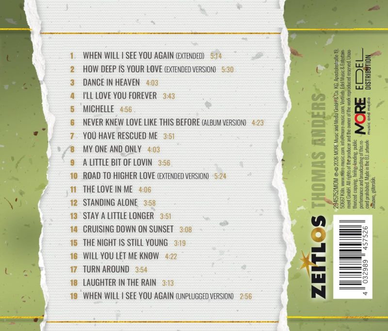 „Zeitlos – Thomas Anders“ widmet sich seiner 90er-Jahre-Phase, die von einfühlsamen Songs und eindrucksvollen Cover-Versionen geprägt war. „When Will I See You Again“, „How Deep Is Your Love”, “I’ll Love You Forever”, “Cruising Down On Sunset”, “The Love In Me”, “Standing Alone” sind Songs, die seine unverwechselbare Stimme und emotionale Tiefe perfekt in Szene setzen.