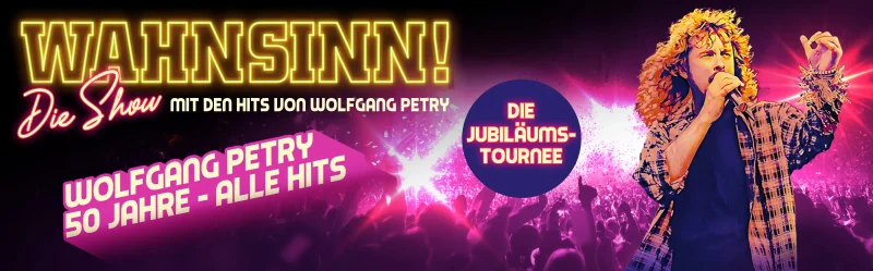 Der WAHNSINN geht auch 2027 weiter! „Wahnsinn – Die Show“, die große Wolfgang Petry Geburtstagsparty geht in die Verlängerung. 2026 ist das Jahr, in dem „Wolle „seinen 75. Geburtstag feiert sowie sein 50. Bühnenjubiläum hätte! Wenngleich er nicht mehr selbst auf der Bühne steht, so haben seine Fans den größten Spaß, all seine Songs und Ohrwürmer zu feiern. „Wahnsinn – Die Show“ – bietet nicht nur jede Menge Wolfgang Petry-Hits, sondern ist gleichzeitig eine atemberaubende Zeitreise, die bewegende Momente, unterhaltsame Geschichten und persönliche Anekdoten aus Wolfgang Petrys Karriere noch einmal aufleben lässt. Aufgrund der überwältigenden Nachfrage wird die Tournee „Wahnsinn – Die Show“ in ihrer Jubiläumsedition im Frühjahr 2027 fortgesetzt: 15 neue Städte in Deutschland und Österreich stehen auf dem erweiterten Tour-Plan.