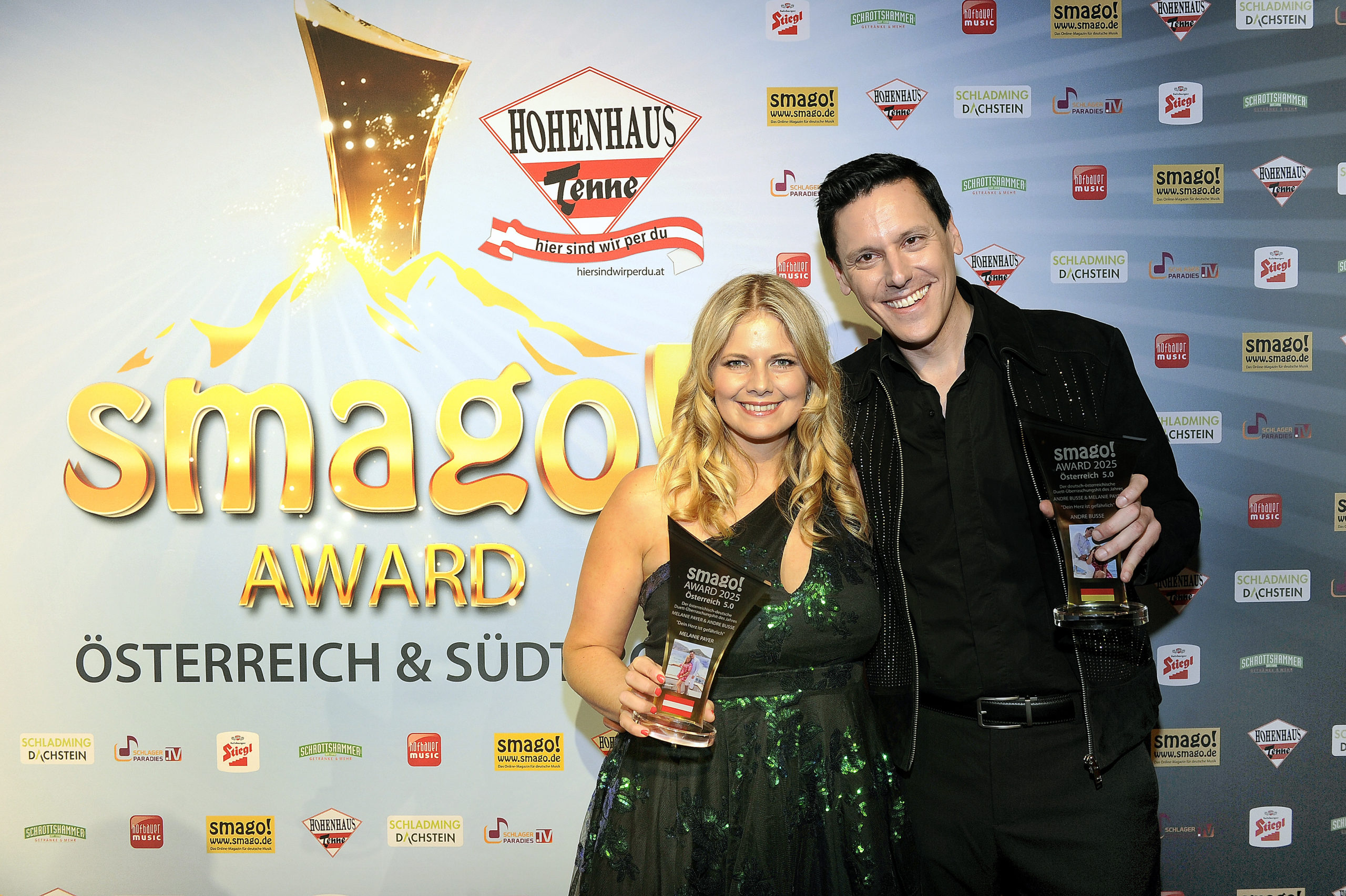 ANDRE BUSSE & MELANIE PAYER sind am 10.04.2025 beim smago! Award Österreich 5.0 in der Hohenhaus Tenne in Schladming in der Kategorie „Deutsch-österreichischer Duett-Überraschungshit des Jahres“ ausgezeichnet worden.