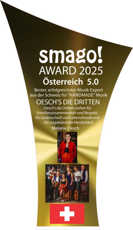 Die Formation OESCH’S DIE DRITTEN wurde am vergangenen Donnerstag (10.04.2025) beim smago! Award Österreich 5.0 als „Bester, erfolgreichster Musik-Export aus der Schweiz für ‚HÄNDMADE‘ Musik“ ausgezeichnet. (Das aktuelle Album der Familienband trägt den Titel „Händmade“ …)